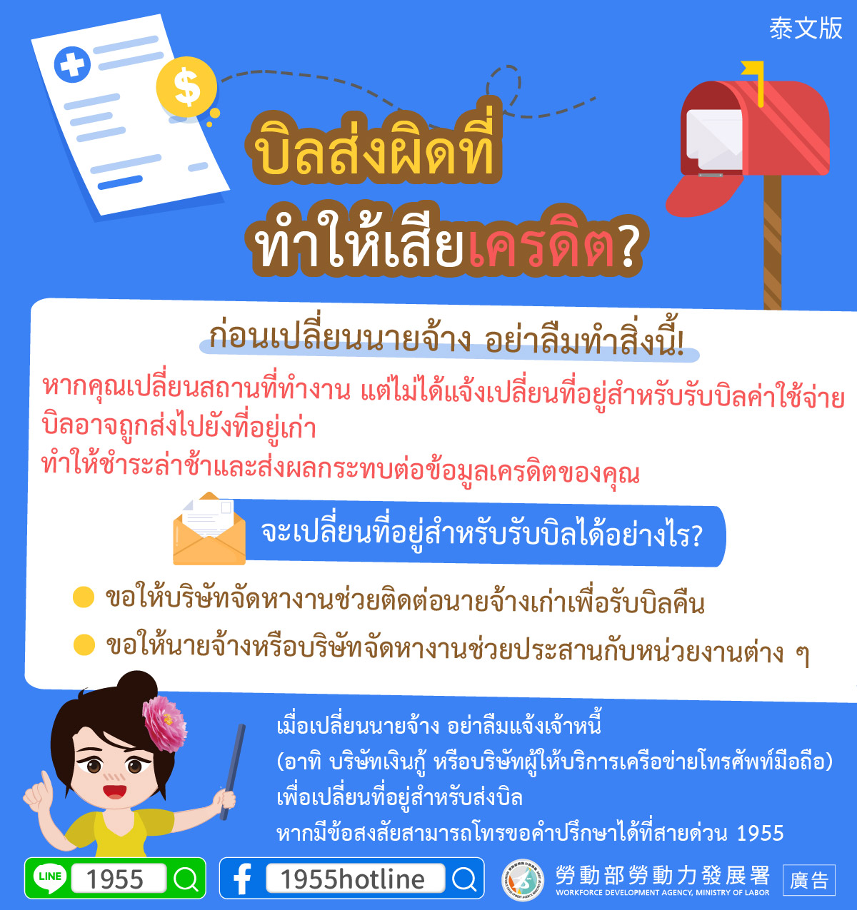 เมื่อเปลี่ยนนายจ้าง อย่าลืมแจ้งเจ้าหนี้ (อาทิ บริษัทเงินกู้ หรือบริษัทผู้ให้บริการเครือข่ายโทรศัพท์มือถือ) เพื่อเปลี่ยนที่อยู่สำหรับส่งบิล หากมีข้อสงสัยสามารถโทรขอคำปรึกษาได้ที่สายด่วน 1955