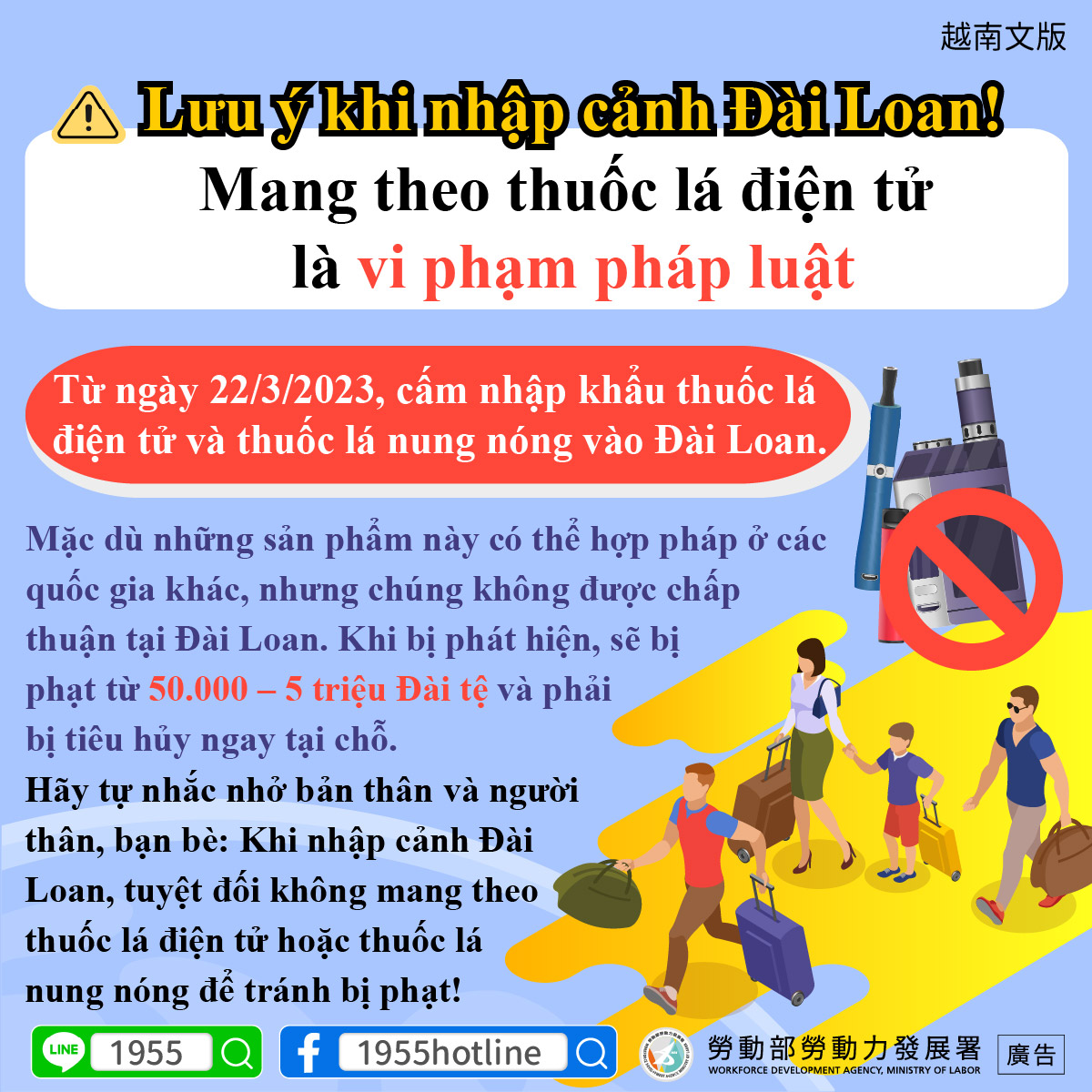 Hãy tự nhắc nhở bản thân và người thân, bạn bè: Khi nhập cảnh Đài Loan, tuyệt đối không mang theo thuốc lá điện tử hoặc thuốc lá nung nóng để tránh bị phạt!