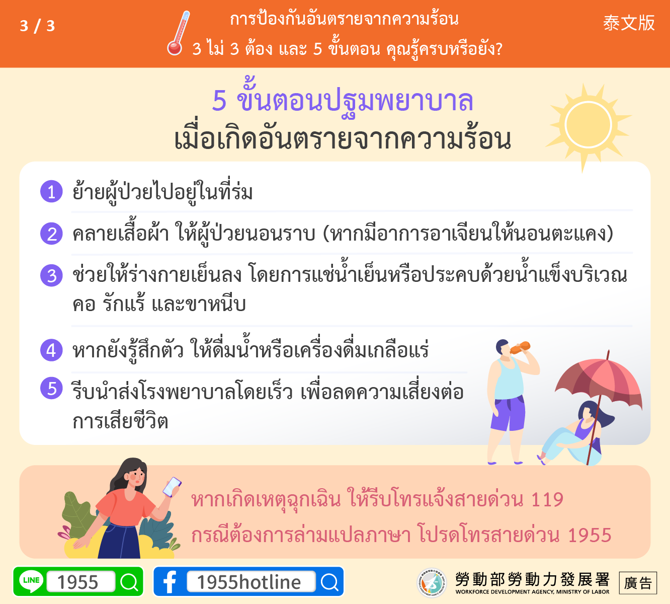 หากเกิดเหตุฉุกเฉิน ให้รีบโทรแจ้งสายด่วน 119 กรณีต้องการล่ามแปลภาษา โปรดโทรสายด่วน 1955