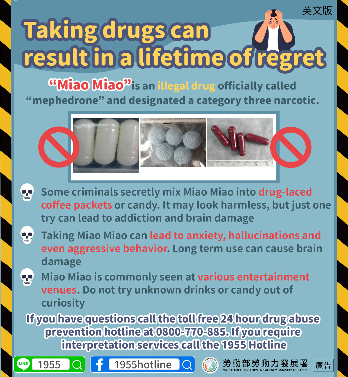 If you have questions call the toll free 24 hour drug abuse prevention hotline at 0800-770-885. If you require interpretation services call the 1955 Hotline
