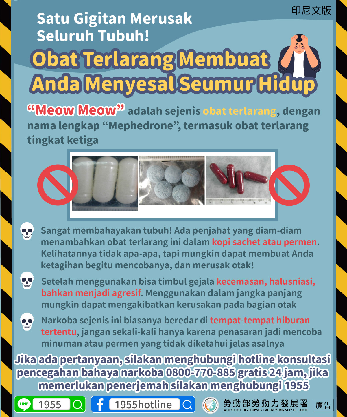 Jika ada pertanyaan, silakan menghubungi hotline konsultasi pencegahan bahaya narkoba 0800-770-885 gratis 24 jam, jika memerlukan penerjemah silakan menghubungi 1955