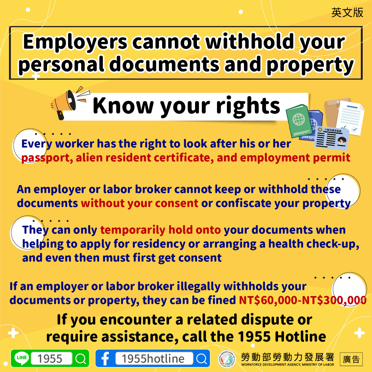 •If an employer or labor broker illegally withholds your documents or property, they can be fined NT$60,000-NT$300,000