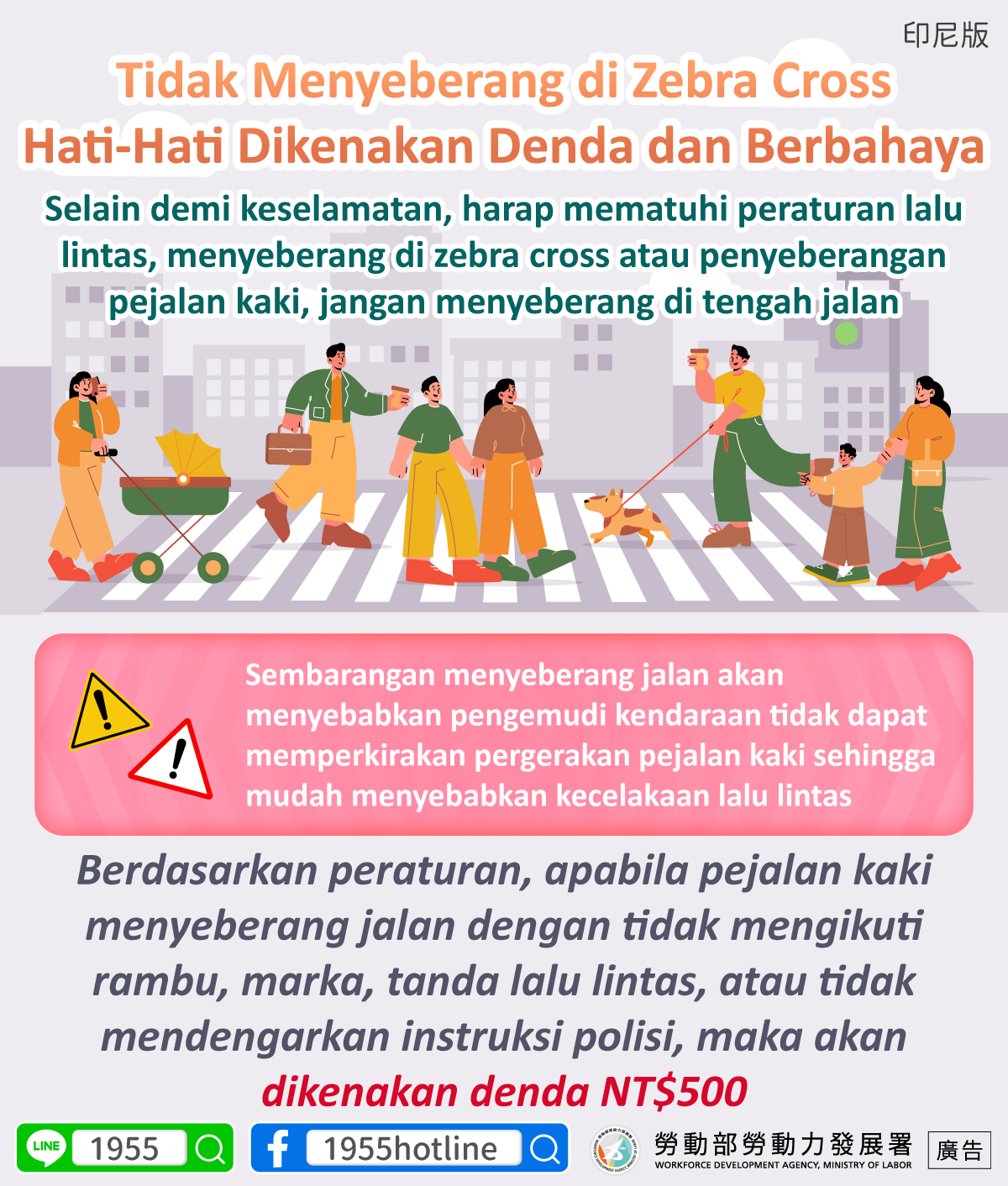Selain demi keselamatan, harap mematuhi peraturan lalu lintas, menyeberang di zebra cross atau penyeberangan pejalan kaki, jangan menyeberang di tengah jalan