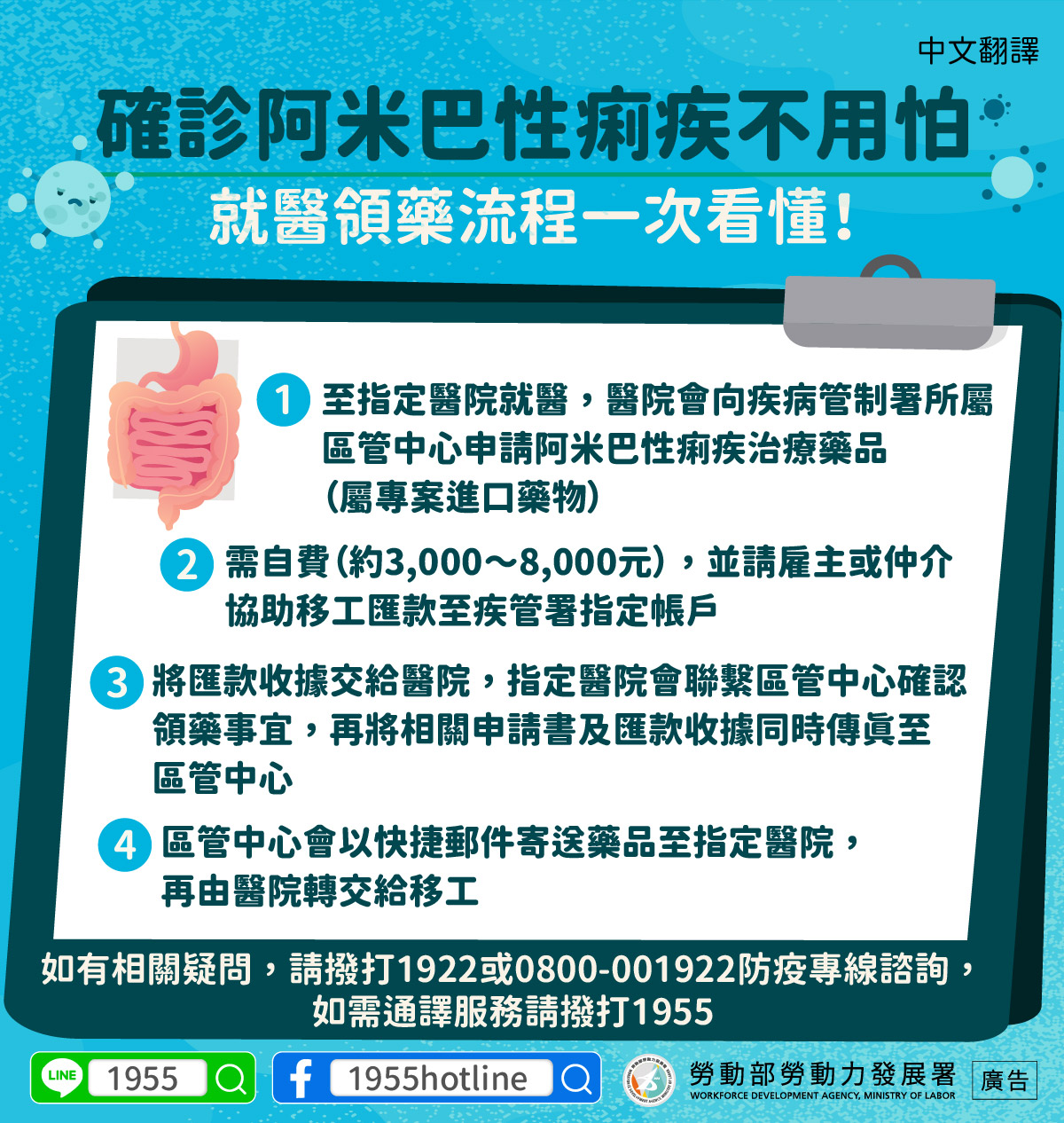 1.Go to a designated hospital for treatment; the hospital will apply to a regional center under the Taiwan Centers of Disease Control (CDC) for the medication (which is specifically approved for importation) to treat amebic dysentery