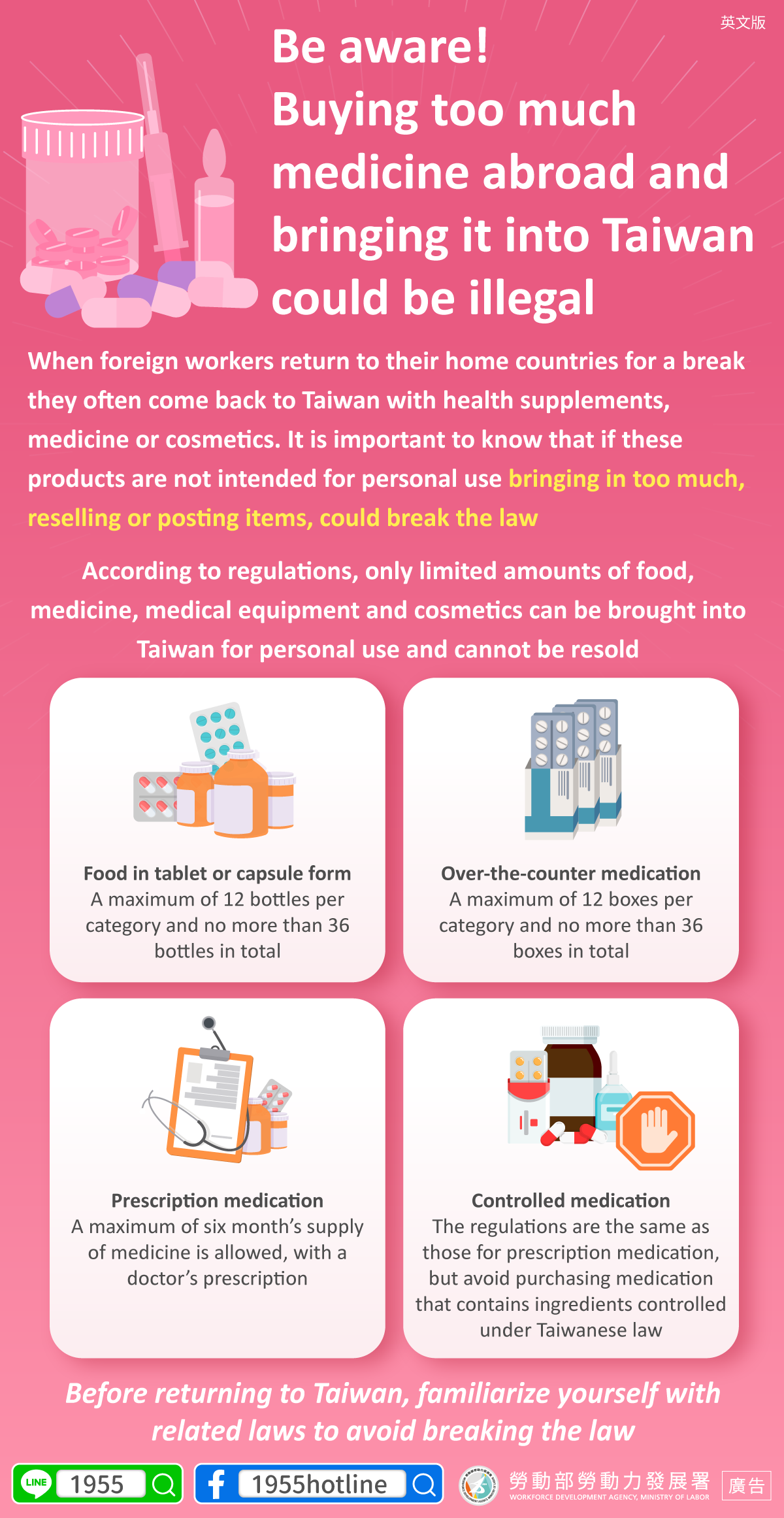 When foreign workers return to their home countries for a break they often come back to Taiwan with health supplements, medicine or cosmetics. It is important to know that if these products are not intended for personal use bringing in too much, reselling or posting items, could break the law