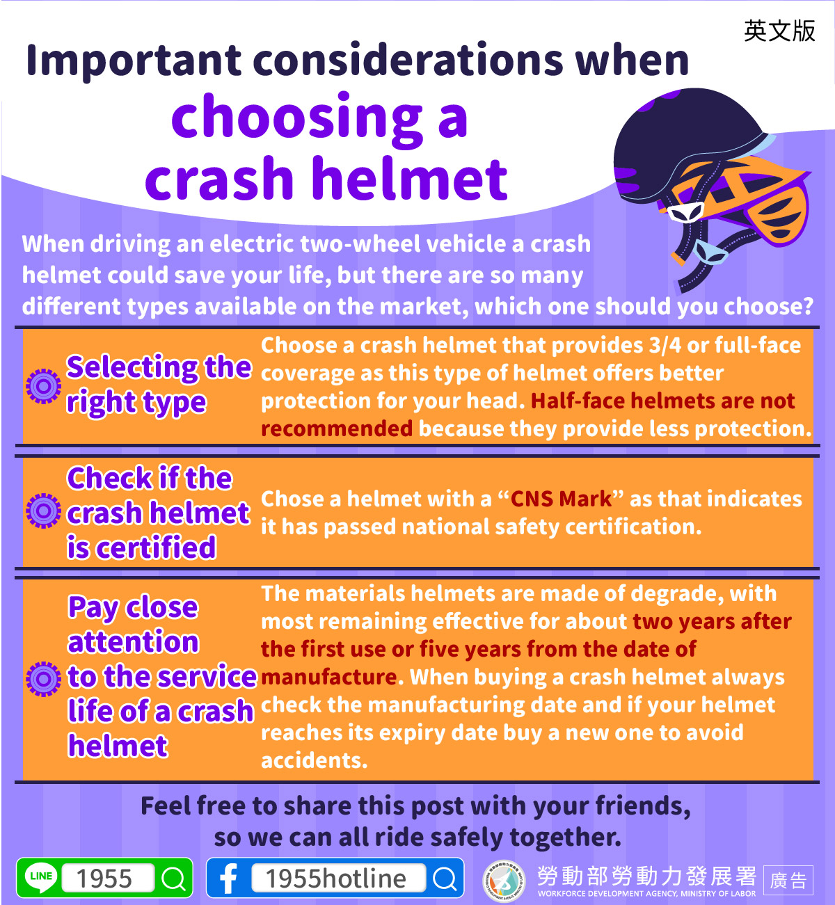 Check if the crash helmet is certified : Chose a helmet with a “CNS Mark” as that indicates it has passed national safety certification.