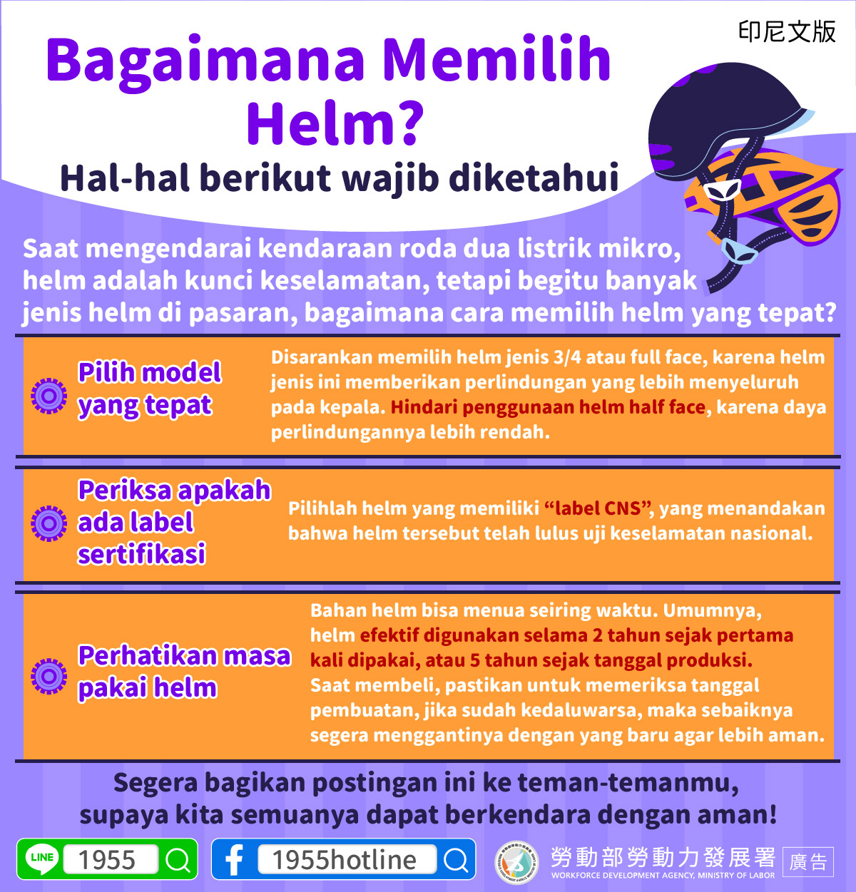 Perhatikan masa pakai helm : Bahan helm bisa menua seiring waktu. Umumnya, helm efektif digunakan selama 2 tahun sejak pertama kali dipakai, atau 5 tahun sejak tanggal produksi. Saat membeli, pastikan untuk memeriksa tanggal pembuatan, jika sudah kedaluwarsa, maka sebaiknya segera menggantinya dengan yang baru agar lebih aman.