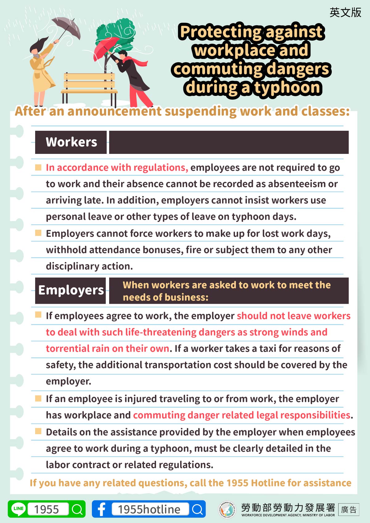 •In accordance with regulations, employees are not required to go to work and their absence cannot be recorded as absenteeism or arriving late. In addition, employers cannot insist workers use personal leave or other types of leave on typhoon days.