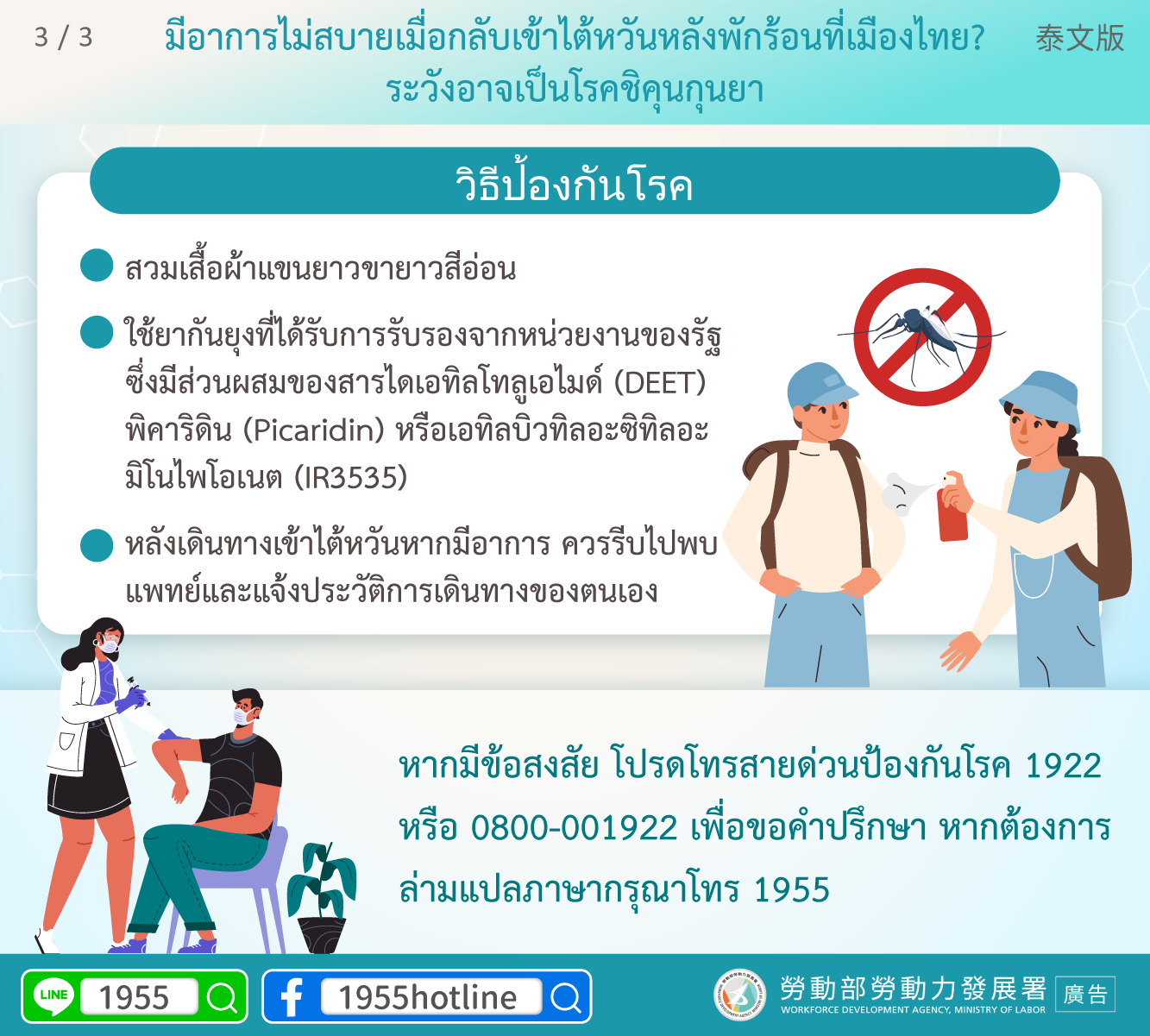 หากมีข้อสงสัย โปรดโทรสายด่วนป้องกันโรค 1922 หรือ 0800-001922 เพื่อขอคำปรึกษา หากต้องการล่ามแปลภาษากรุณาโทร 1955