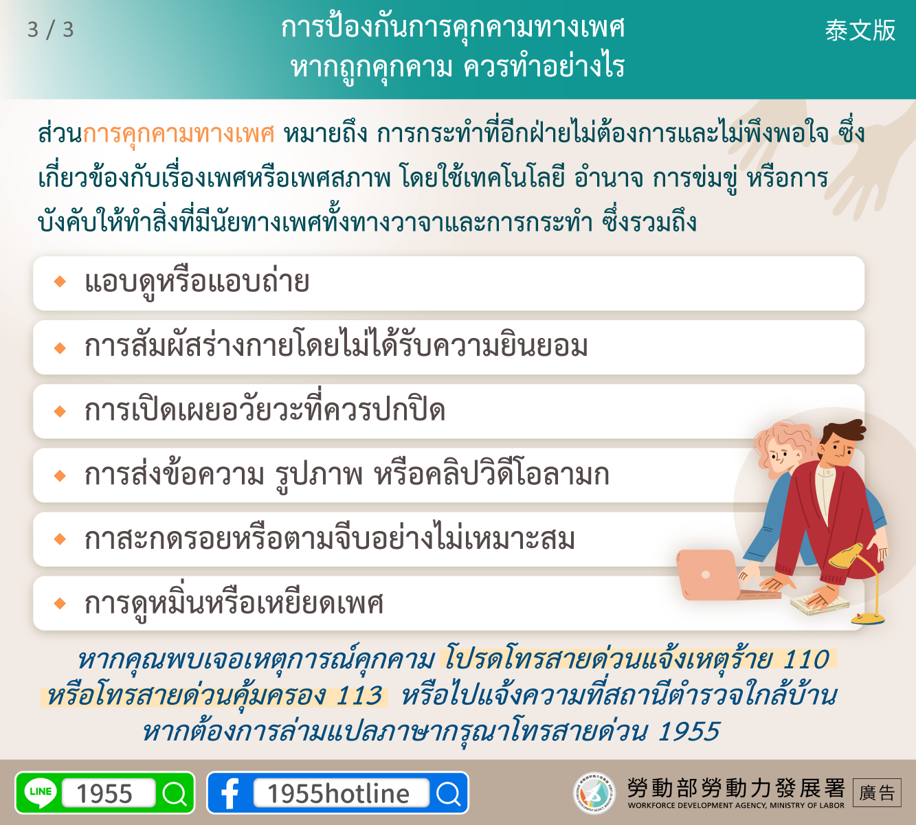หากคุณพบเจอเหตุการณ์คุกคาม โปรดโทรสายด่วนแจ้งเหตุร้าย 110หรือโทรสายด่วนคุ้มครอง 113 หรือไปแจ้งความที่สถานีตำรวจใกล้บ้าน
