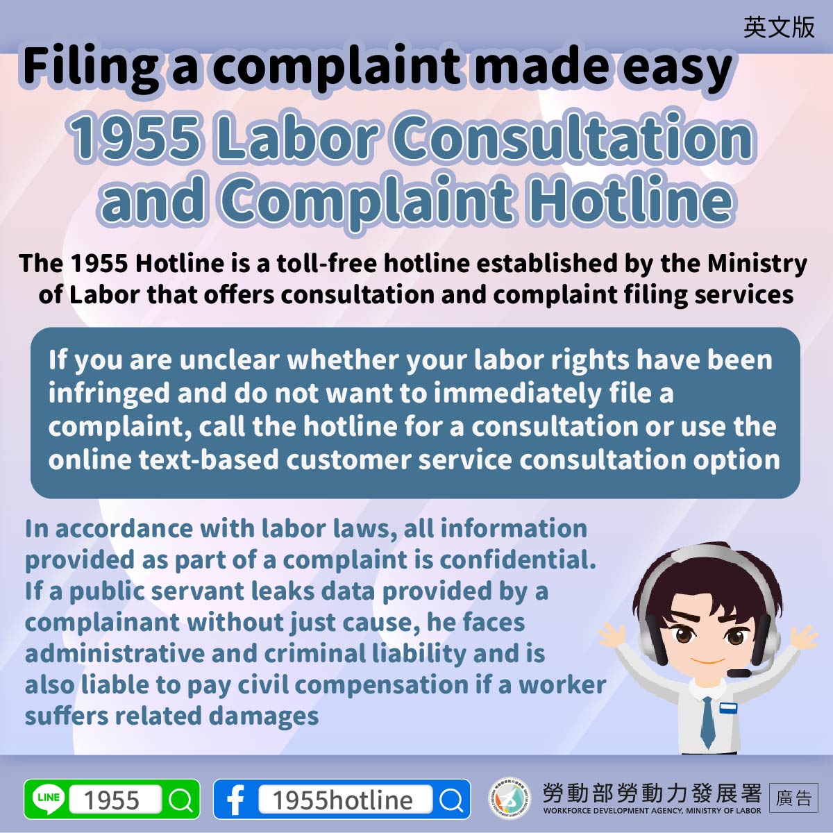 1955為勞動部建置的免費諮詢申訴專線,專線結合了諮詢及申訴的服務