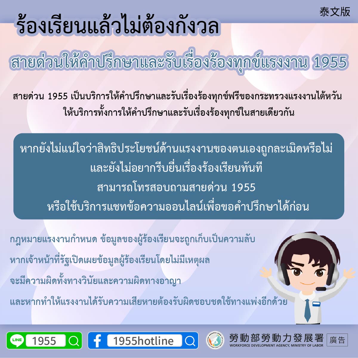 ▍ร้องเรียนแล้วไม่ต้องกังวล สายด่วนให้คำปรึกษาและรับเรื่องร้องทุกข์แรงงาน 1955