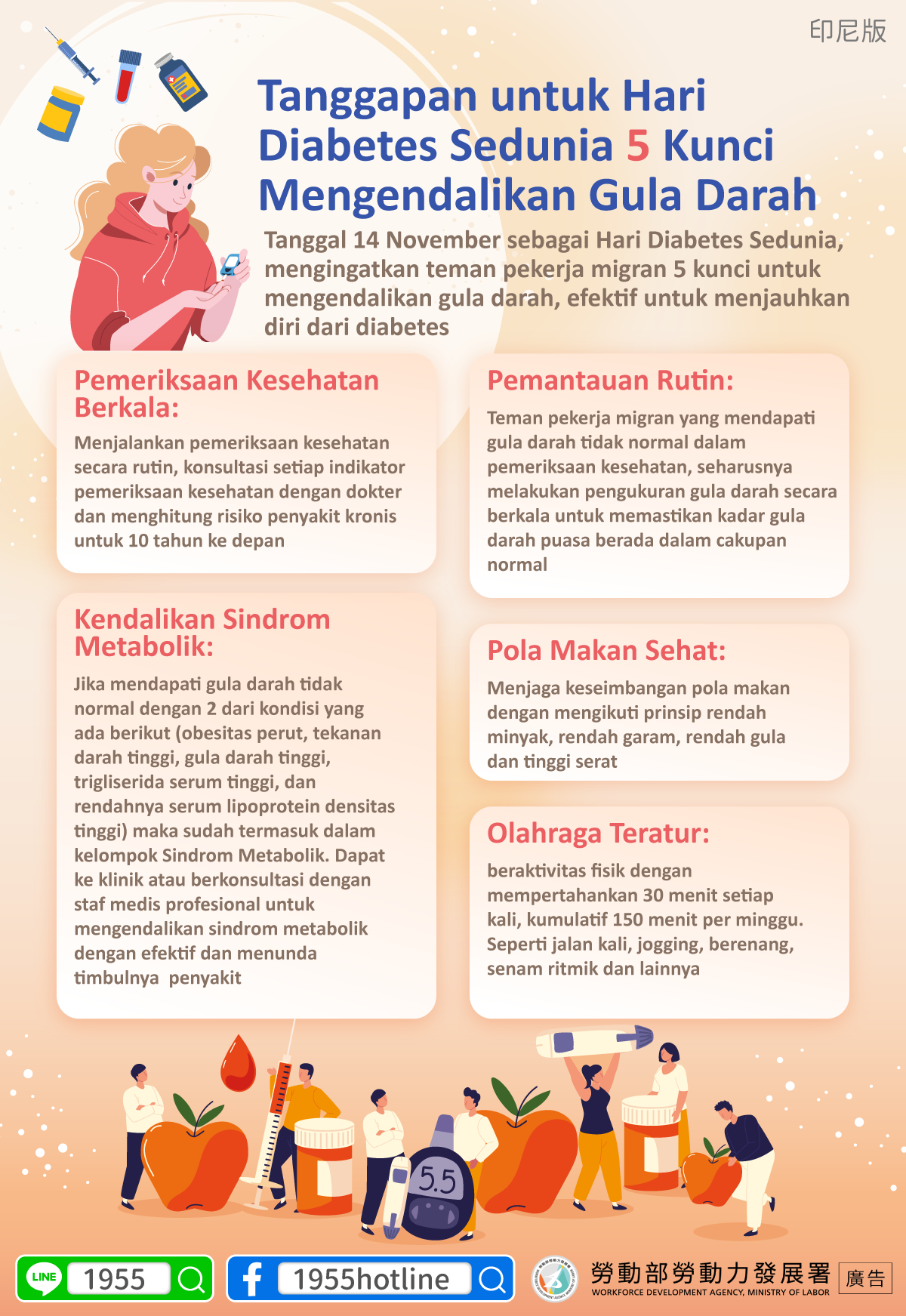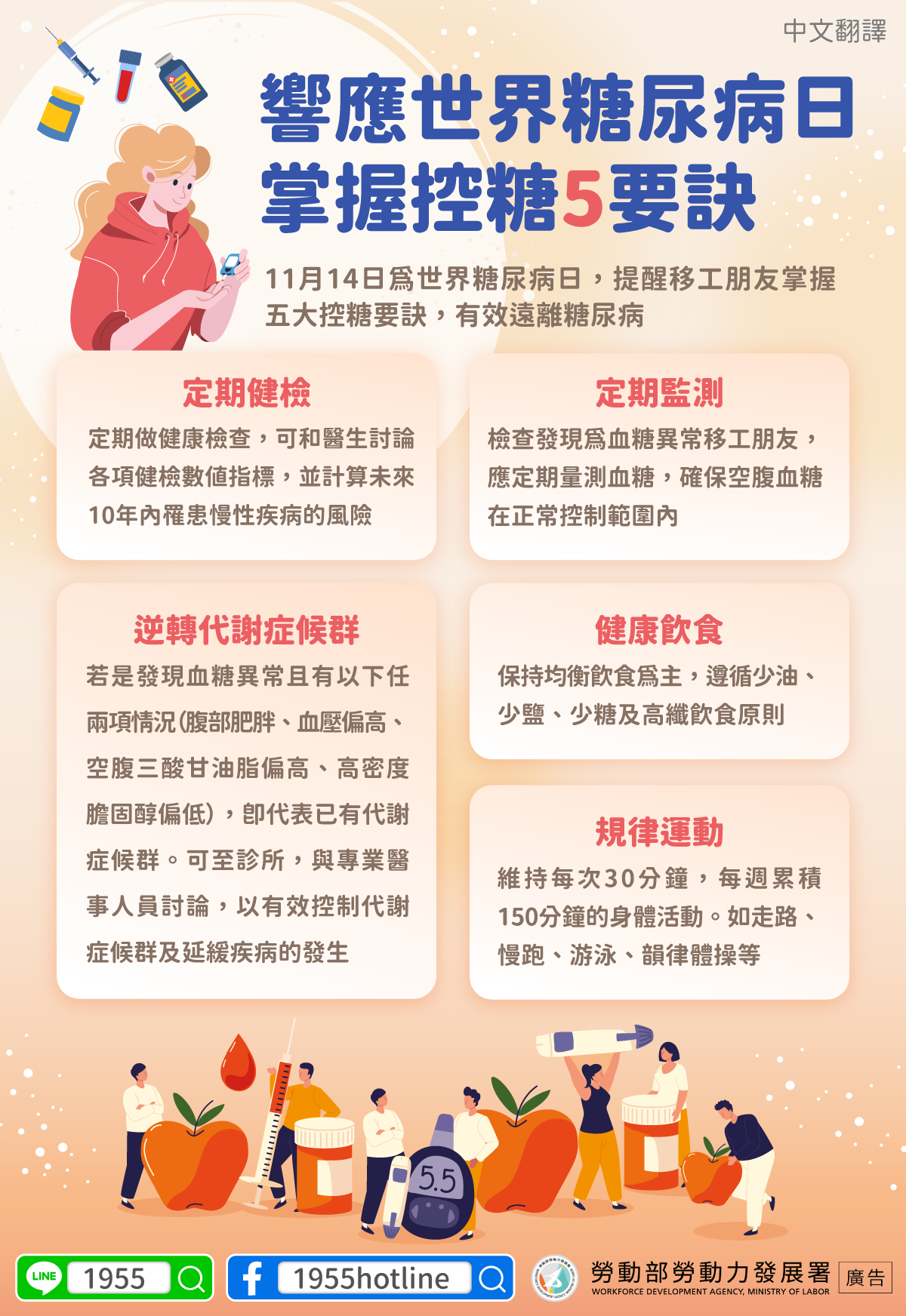 11月14日為世界糖尿病日,提醒移工朋友掌握五大控糖要訣,有效遠離糖尿病