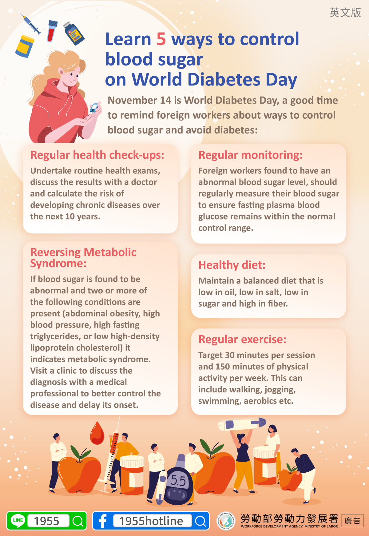 November 14 is World Diabetes Day, a good time to remind foreign workers about ways to control blood sugar and avoid diabetes: