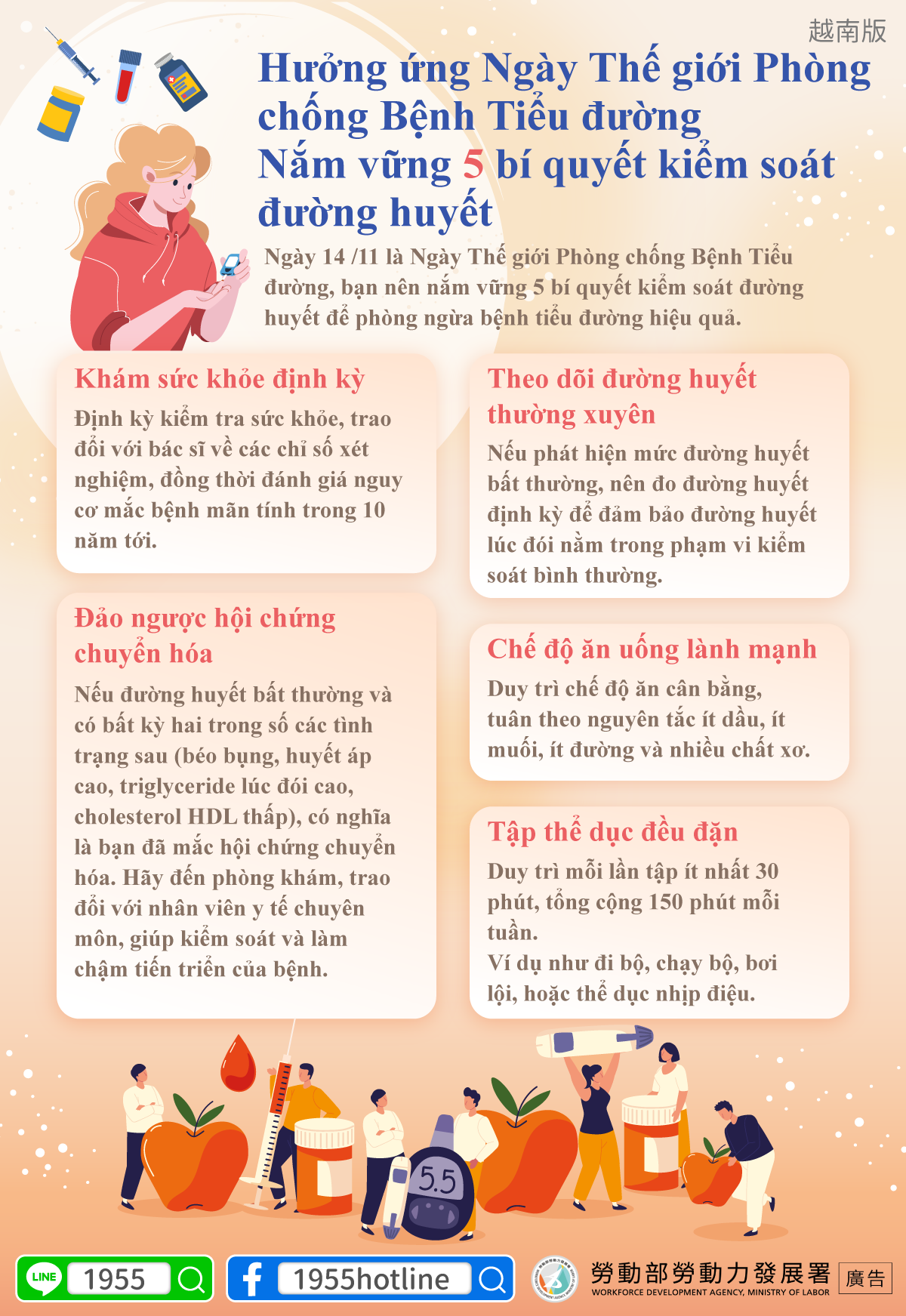 Tanggal 14 November sebagai Hari Diabetes Sedunia, mengingatkan teman pekerja migran 5 kunci untuk mengendalikan gula darah, efektif untuk menjauhkan diri dari diabetes