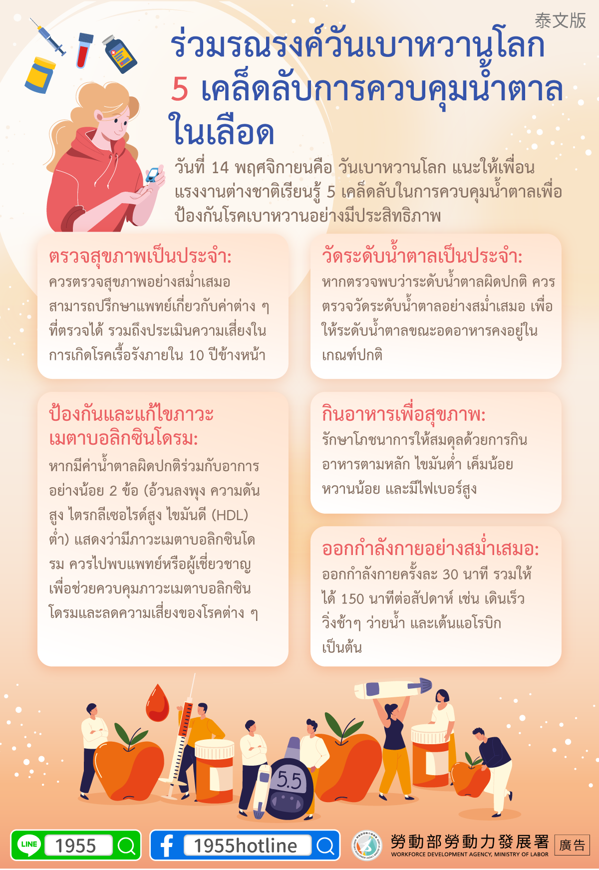 วันที่ 14 พฤศจิกายนคือ วันเบาหวานโลก แนะให้เพื่อนแรงงานต่างชาติเรียนรู้ 5 เคล็ดลับในการควบคุมน้ำตาลเพื่อป้องกันโรคเบาหวานอย่างมีประสิทธิภาพ