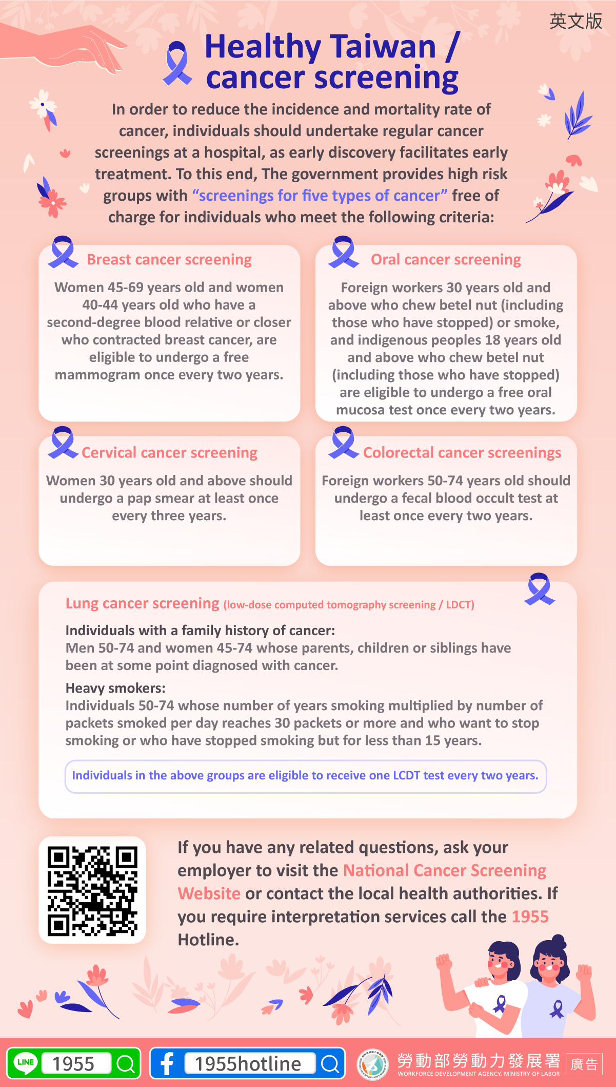 If you have any related questions, ask your employer to visit the National Cancer Screening Website or contact the local health authorities. If you require interpretation services call the 1955 Hotline.