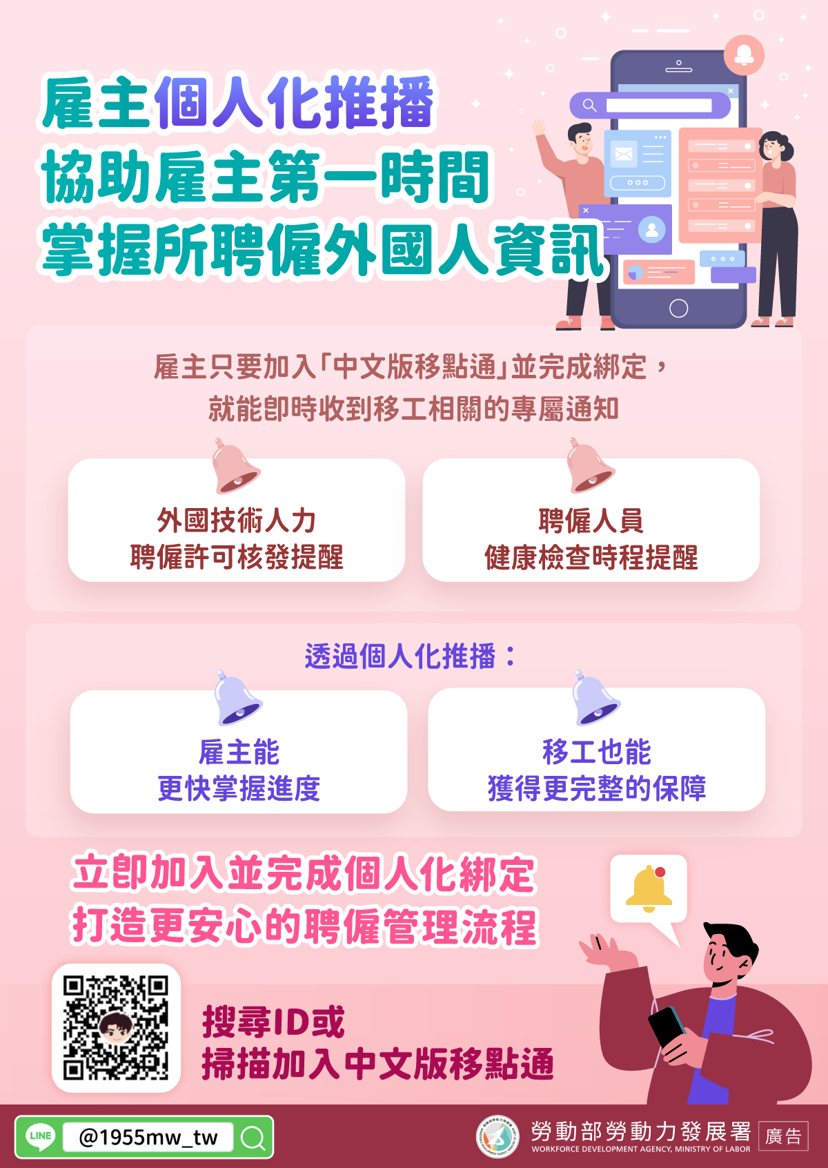 雇主只要加入「中文版移點通」並完成綁定,就能即時收到移工相關的專屬通知