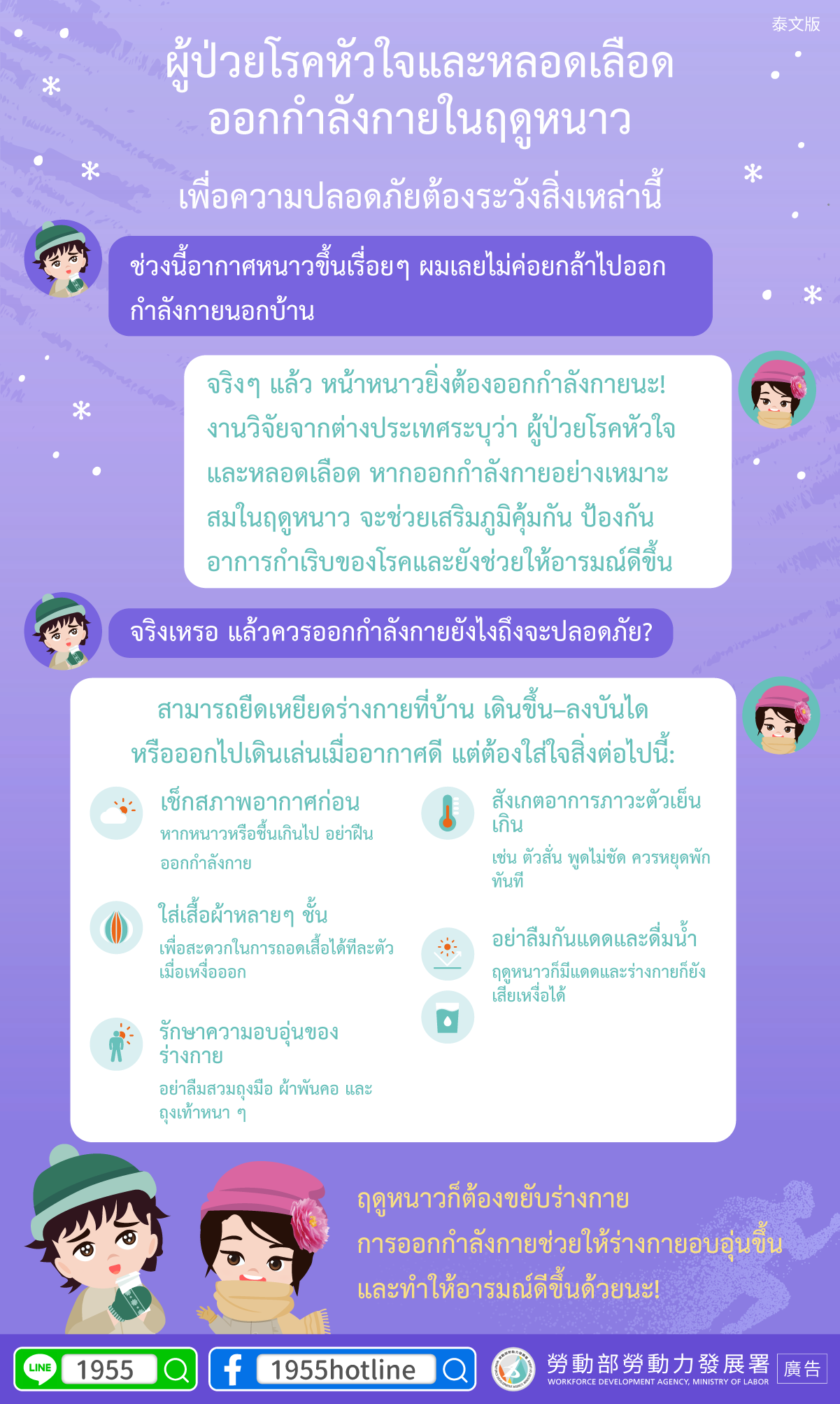 B:จริงๆ แล้ว หน้าหนาวยิ่งต้องออกกำลังกายนะ! งานวิจัยจากต่างประเทศระบุว่า ผู้ป่วยโรคหัวใจและหลอดเลือด หากออกกำลังกายอย่างเหมาะสมในฤดูหนาว จะช่วยเสริมภูมิคุ้มกัน ป้องกันอาการกำเริบของโรคและยังช่วยให้อารมณ์ดีขึ้น