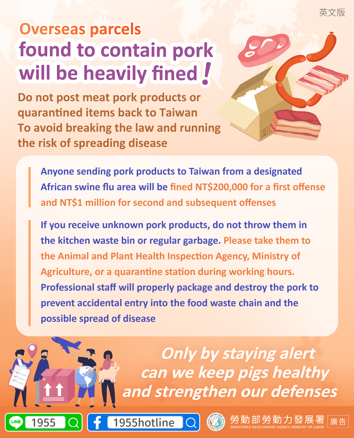 โปรดอย่าส่งพัสดุไปรษณีย์ที่มีผลิตภัณฑ์เนื้อหมูหรือวัตถุใดๆ ที่ต้องกักกันโรคเข้ามาในไต้หวัน เพื่อหลีกเลี่ยงการกระทำผิดกฎหมายและถูกปรับ อีกทั้งเสี่ยงที่จะทำให้เกิดการระบาดของโรค