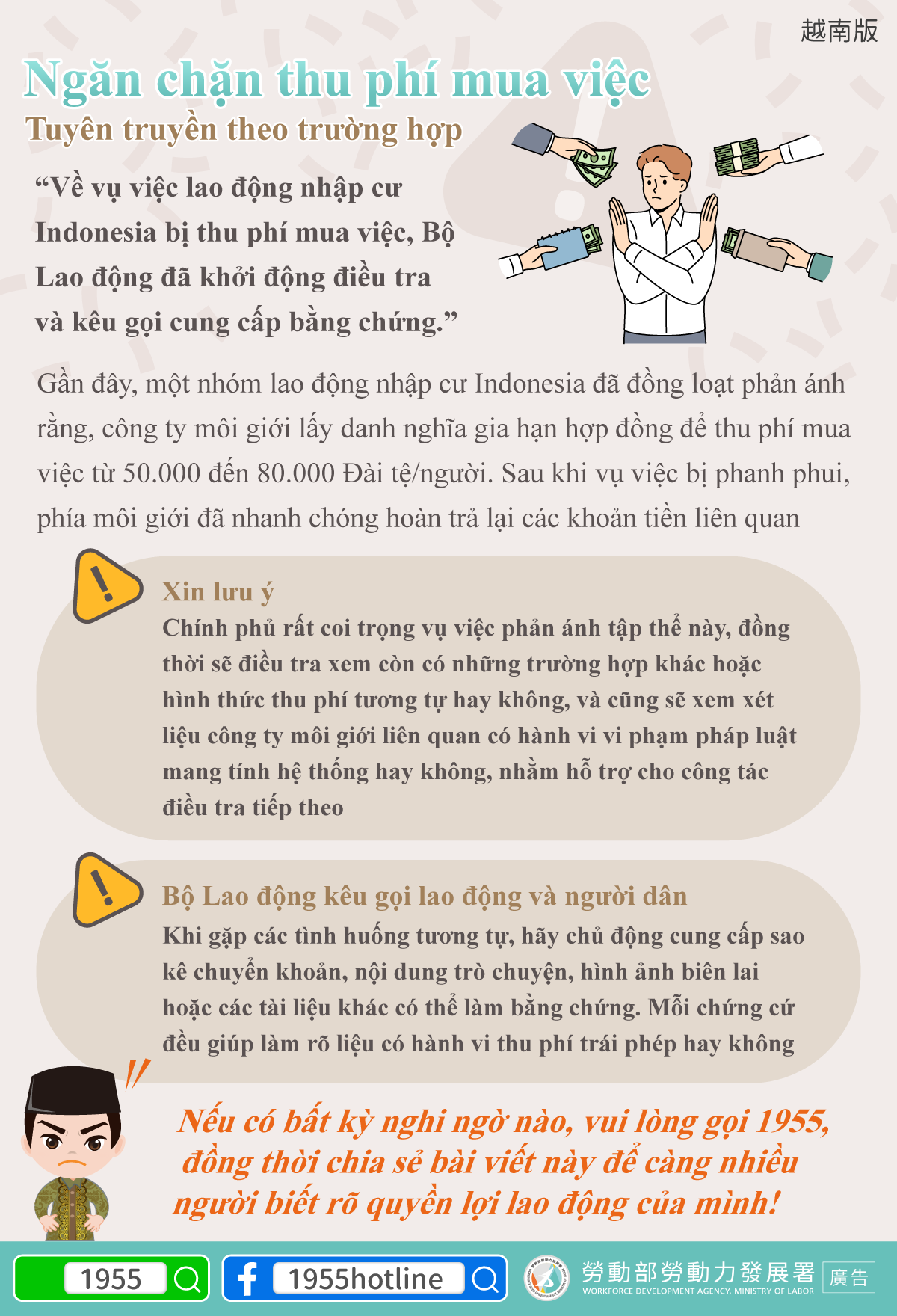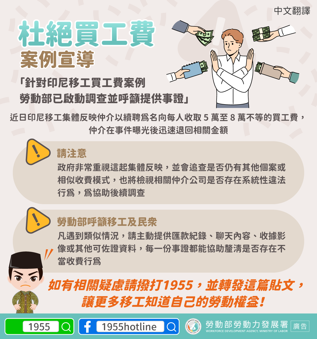If you have related concerns, call the 1955 Hotline. Feel free to repost this message so more foreign workers are aware of their rights in Taiwan