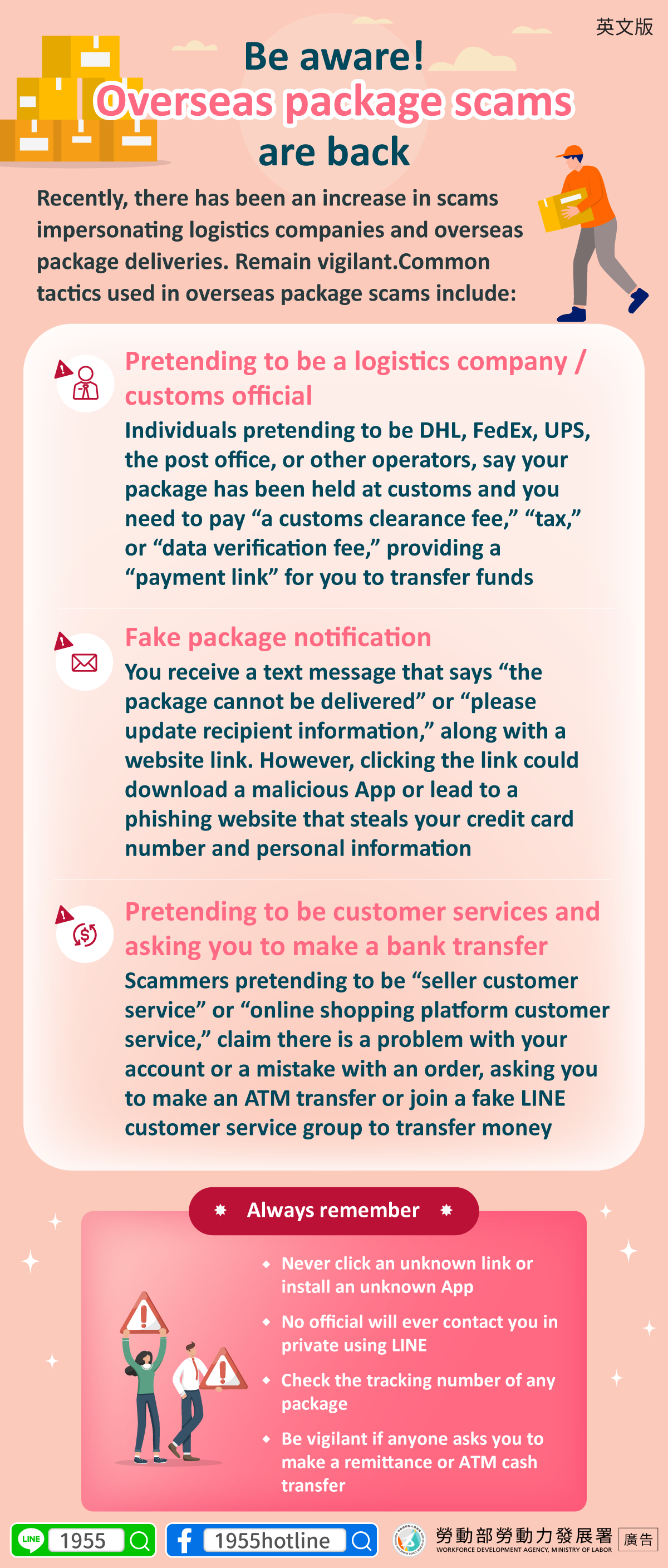 Recently, there has been an increase in scams impersonating logistics companies and overseas package deliveries. Remain vigilant.Common tactics used in overseas package scams include: