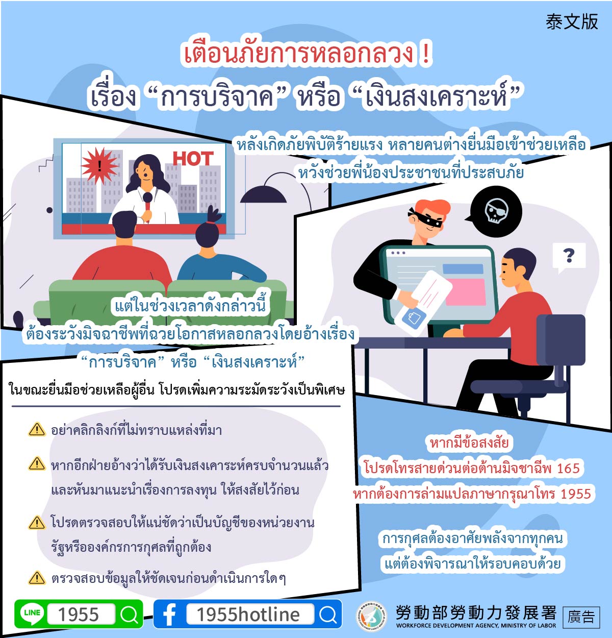 หากมีข้อสงสัย โปรดโทรสายด่วนต่อต้านมิจชาฉีพ 165หากต้องการล่ามแปลภาษากรุณาโทร 1955