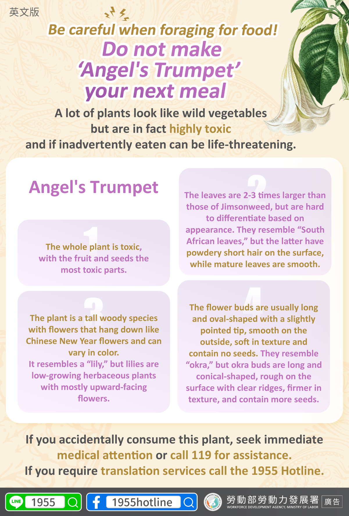 If you accidentally consume this plant, seek immediate medical attention or call 119 for assistance.If you require translation services call the 1955 Hotline.