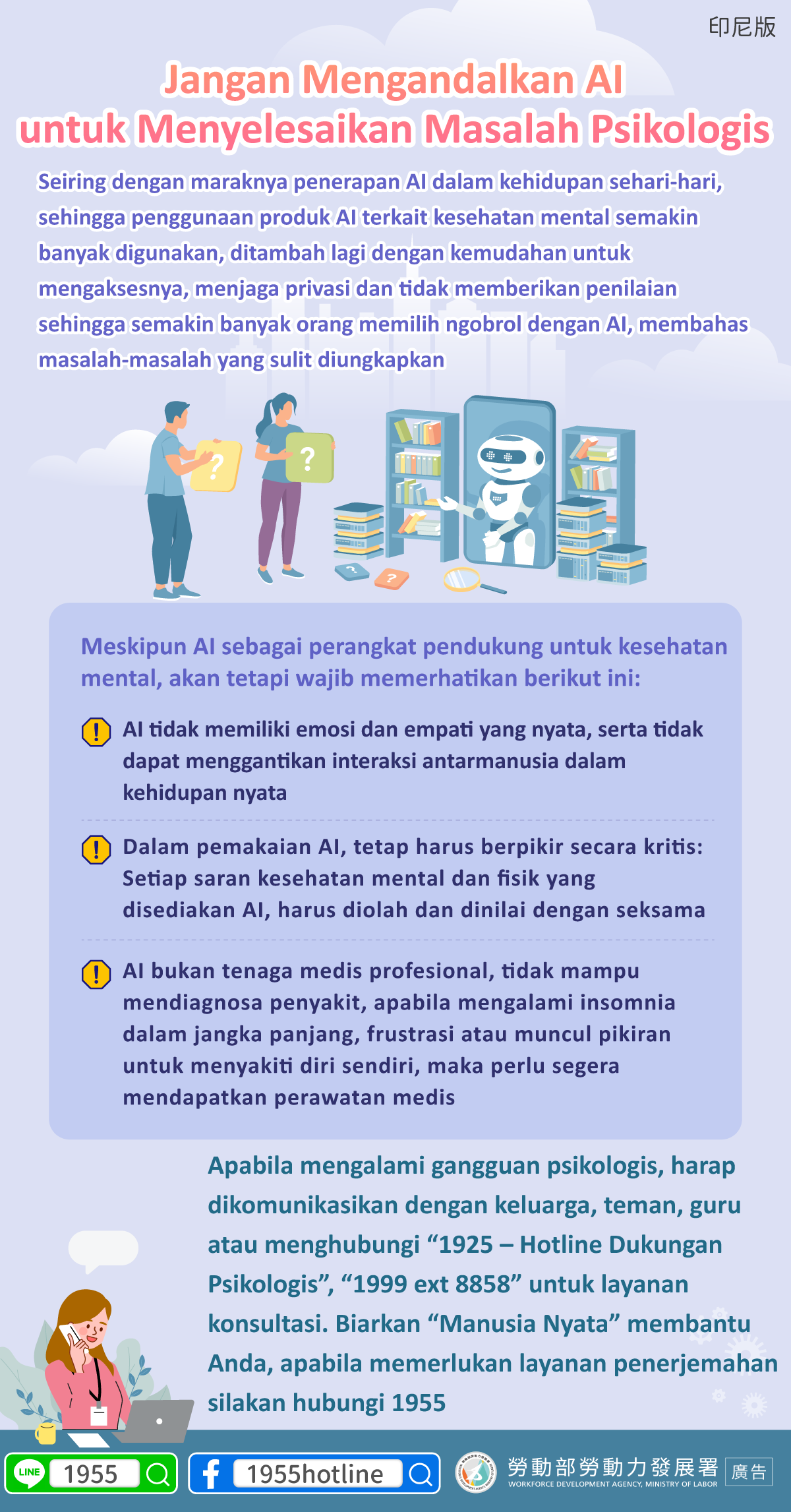 Apabila mengalami gangguan psikologis, harap dikomunikasikan dengan keluarga, teman, guru atau menghubungi “1925 – Hotline Dukungan Psikologis”, “1999 ext 8858” untuk layanan konsultasi. Biarkan “Manusia Nyata” membantu Anda, apabila memerlukan layanan penerjemahan silakan hubungi 1955