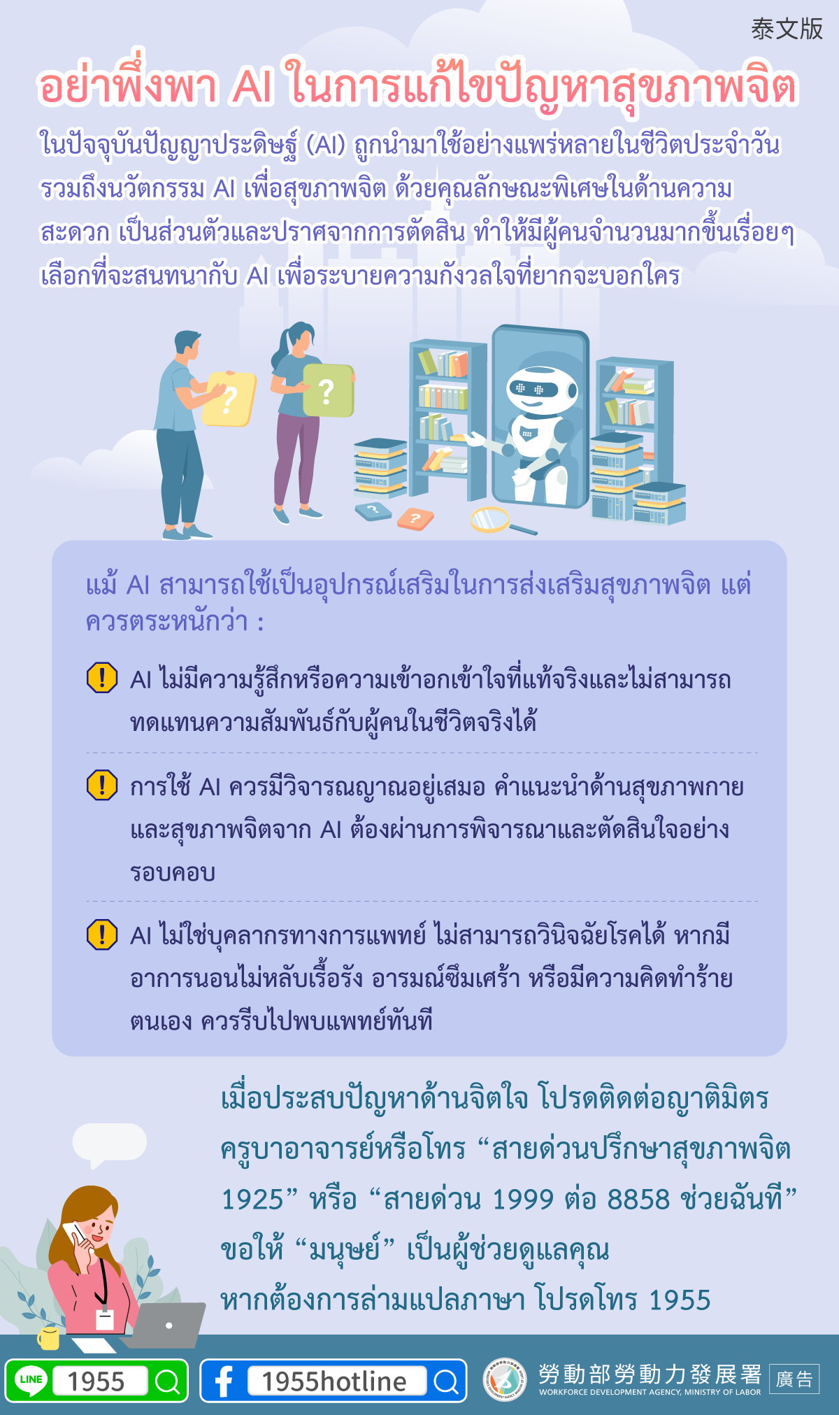 เมื่อประสบปัญหาด้านจิตใจ โปรดติดต่อญาติมิตร ครูบาอาจารย์หรือโทร “สายด่วนปรึกษาสุขภาพจิต 1925” หรือ “สายด่วน 1999 ต่อ 8858 ช่วยฉันที” ขอให้ “มนุษย์” เป็นผู้ช่วยดูแลคุณหากต้องการล่ามแปลภาษา โปรดโทร 1955