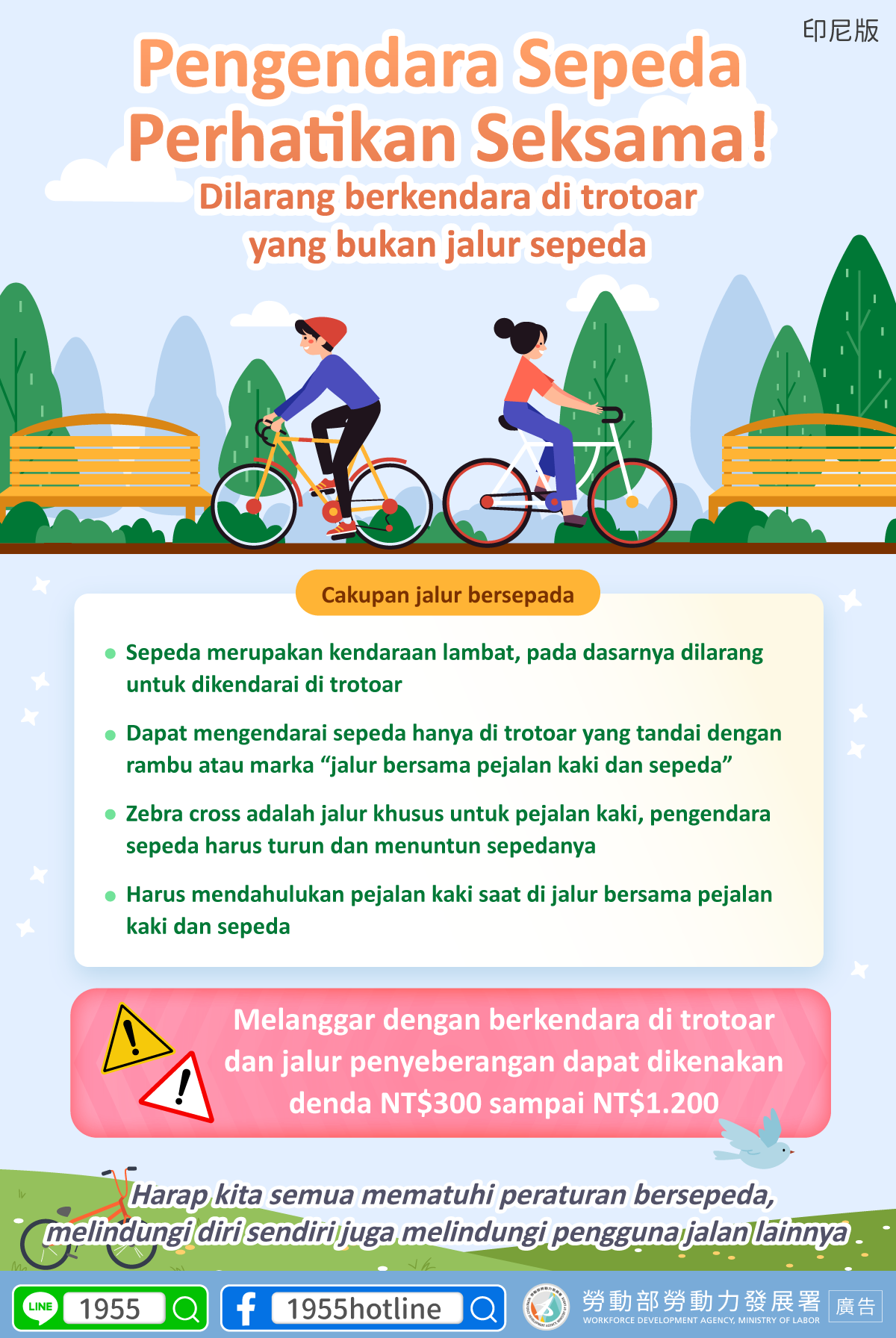 標題:LINE@移點通-【自行車騎士看仔細! 禁止騎乘於未開放共道的人行道】-多國語言版