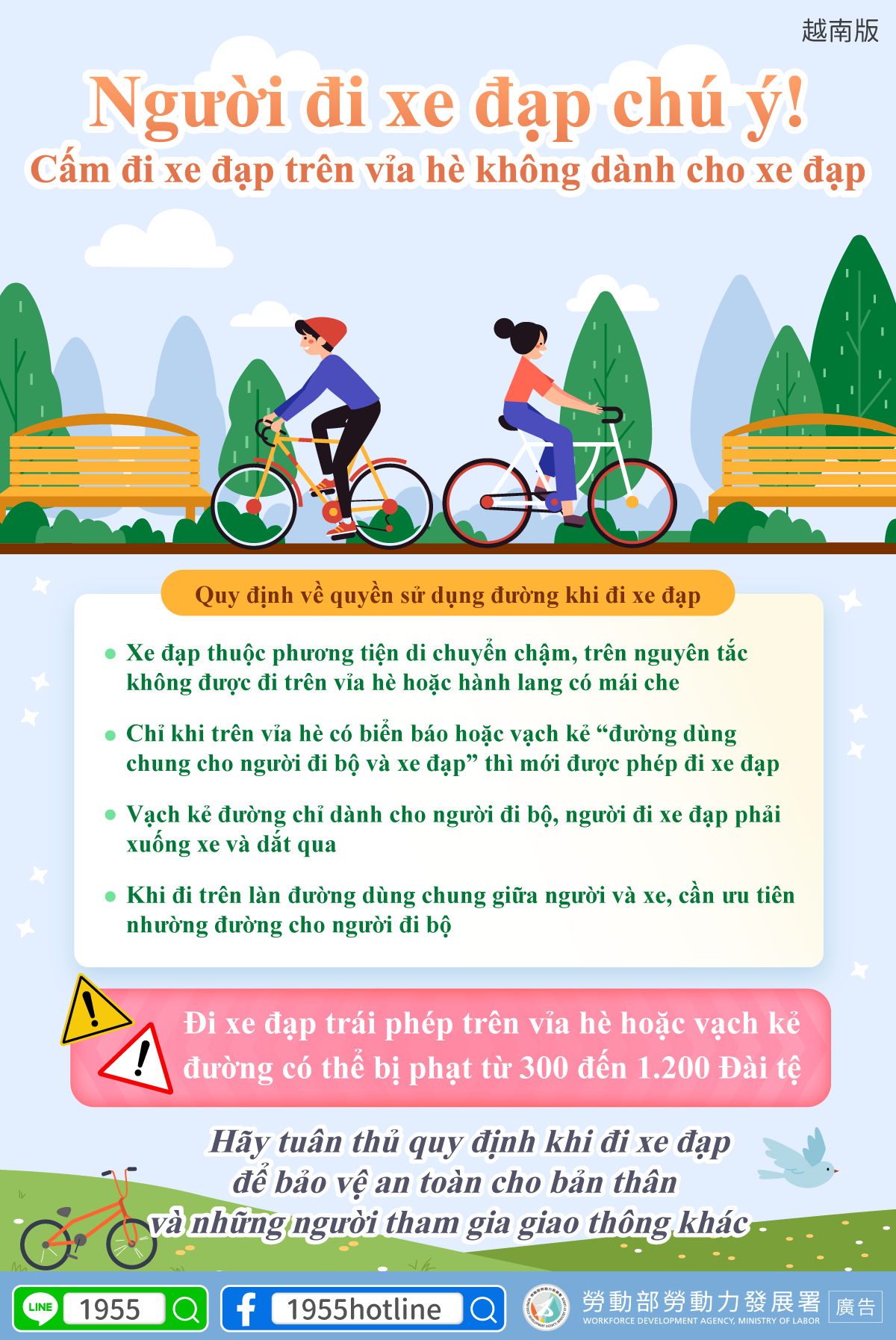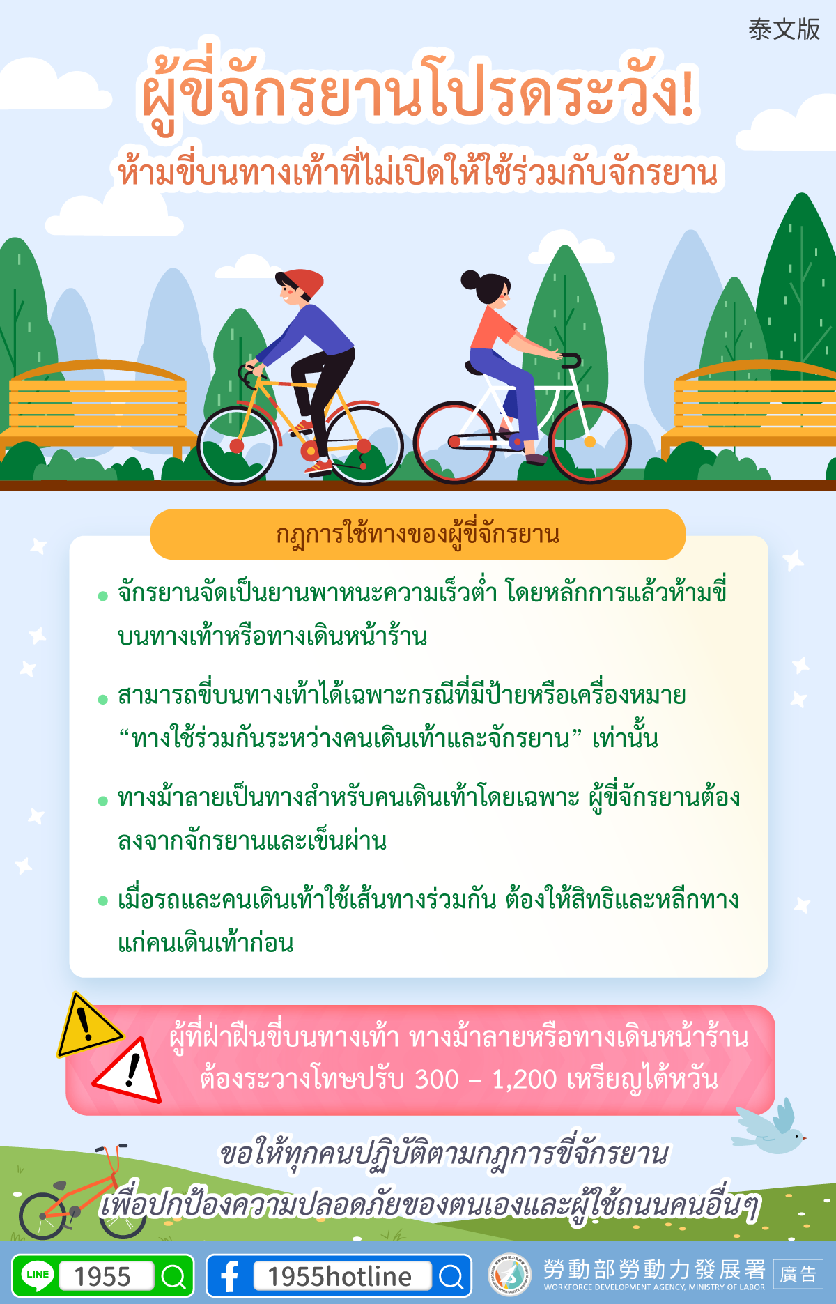 ขอให้ทุกคนปฏิบัติตามกฎการขี่จักรยานเพื่อปกป้องความปลอดภัยของตนเองและผู้ใช้ถนนคนอื่นๆ