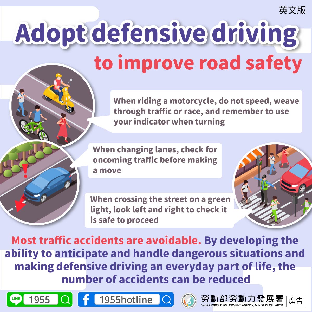 絕大多數車禍都是可以避免的,建立預測危險及處理危險的能力,將防禦駕駛觀念落實到日常的交通行為中,以降低事故發生