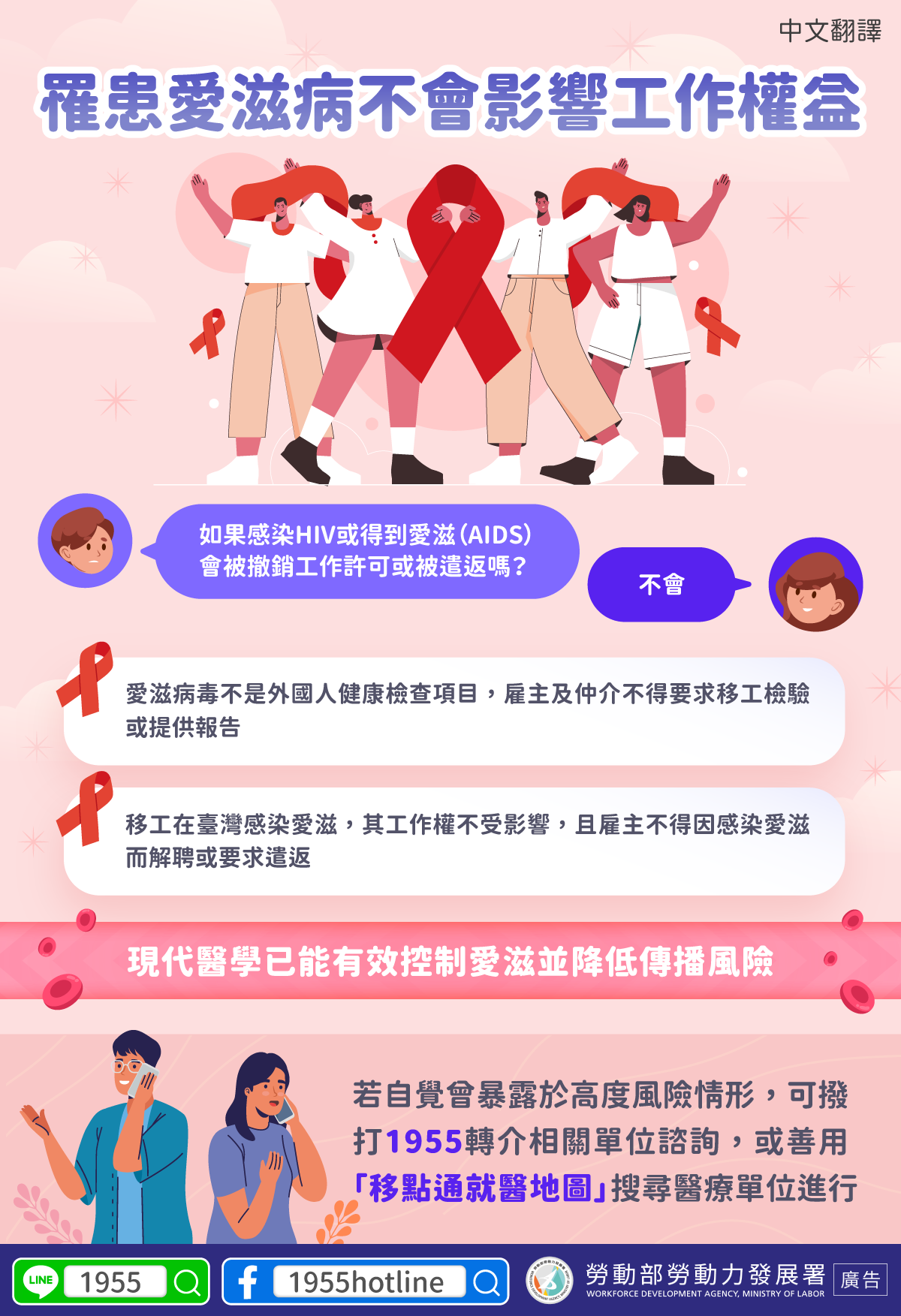หากแรงงานต่างชาติติดเชื้อเอชไอวีในไต้หวันจะไม่กระทบต่อสิทธิในการทำงานและนายจ้างไม่สามารถเลิกจ้างหรือส่งกลับประเทศเนื่องจากการติดเชื้อเอชไอวีได้