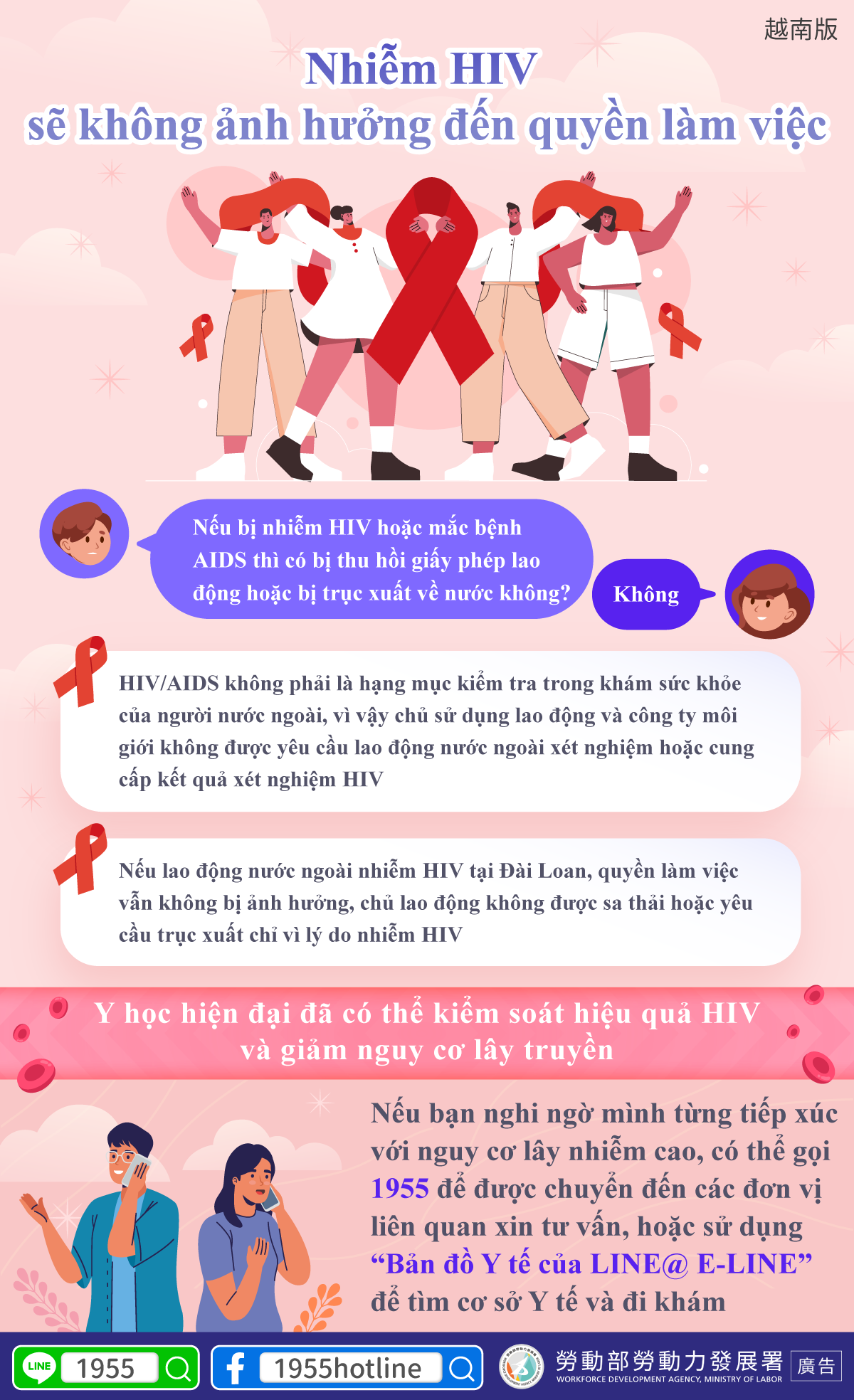 Nếu lao động nước ngoài nhiễm HIV tại Đài Loan, quyền làm việc vẫn không bị ảnh hưởng, chủ lao động không được sa thải hoặc yêu cầu trục xuất chỉ vì lý do nhiễm HIV