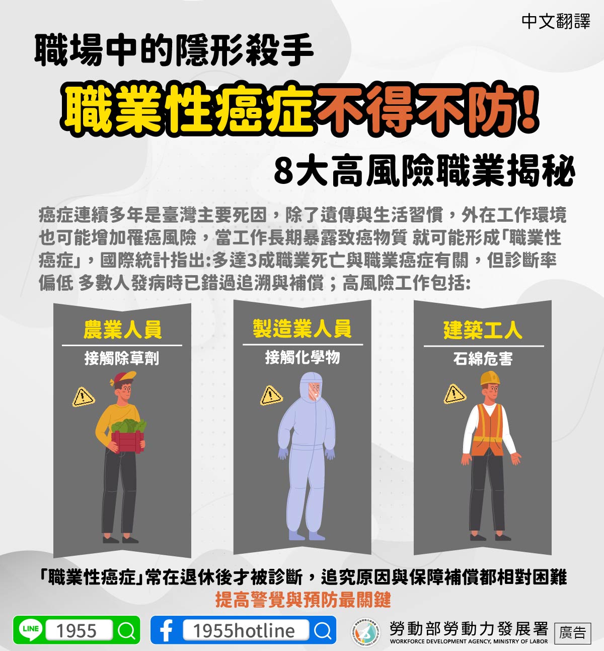 Kanker telah menjadi penyebab utama kematian di Taiwan selama bertahun-tahun, selain faktor keturunan dan kebiasaan hidup, lingkungan kerja eksternal juga dapat meningkatkan risiko terkena kanker, apabila pekerjaan melibatkan paparan jangka panjang terhadap zat karsinogenik, hal itu dapat memicu “kanker akibat kerja”. Statistik internasional menunjukkan: Mencapai 30% kematian akibat kerja berkaitan dengan kanker akibat kerja, tetapi tingkat diagnosisnya tergolong rendah, kebanyakan orang baru terdiagnosis saat penyakit menyerang, sehingga sudah terlambat untuk menelusuri penyebab dan menuntut kompensasi. Pekerjaan berisiko tinggi meliputi:
