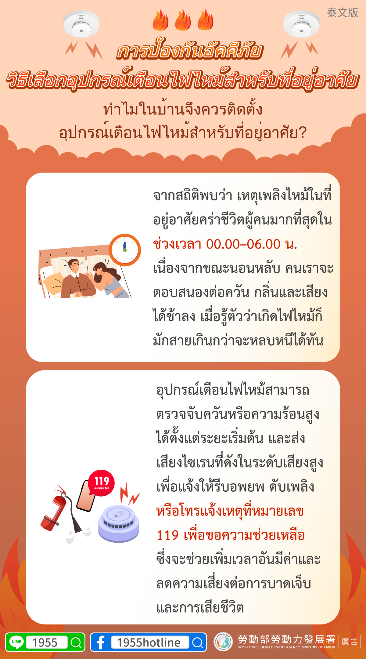 จากสถิติพบว่า เหตุเพลิงไหม้ในที่อยู่อาศัยคร่าชีวิตผู้คนมากที่สุดในช่วงเวลา 00.00–06.00 น. เนื่องจากขณะนอนหลับ คนเราจะตอบสนองต่อควัน กลิ่นและเสียงได้ช้าลง เมื่อรู้ตัวว่าเกิดไฟไหม้ก็มักสายเกินกว่าจะหลบหนีได้ทัน